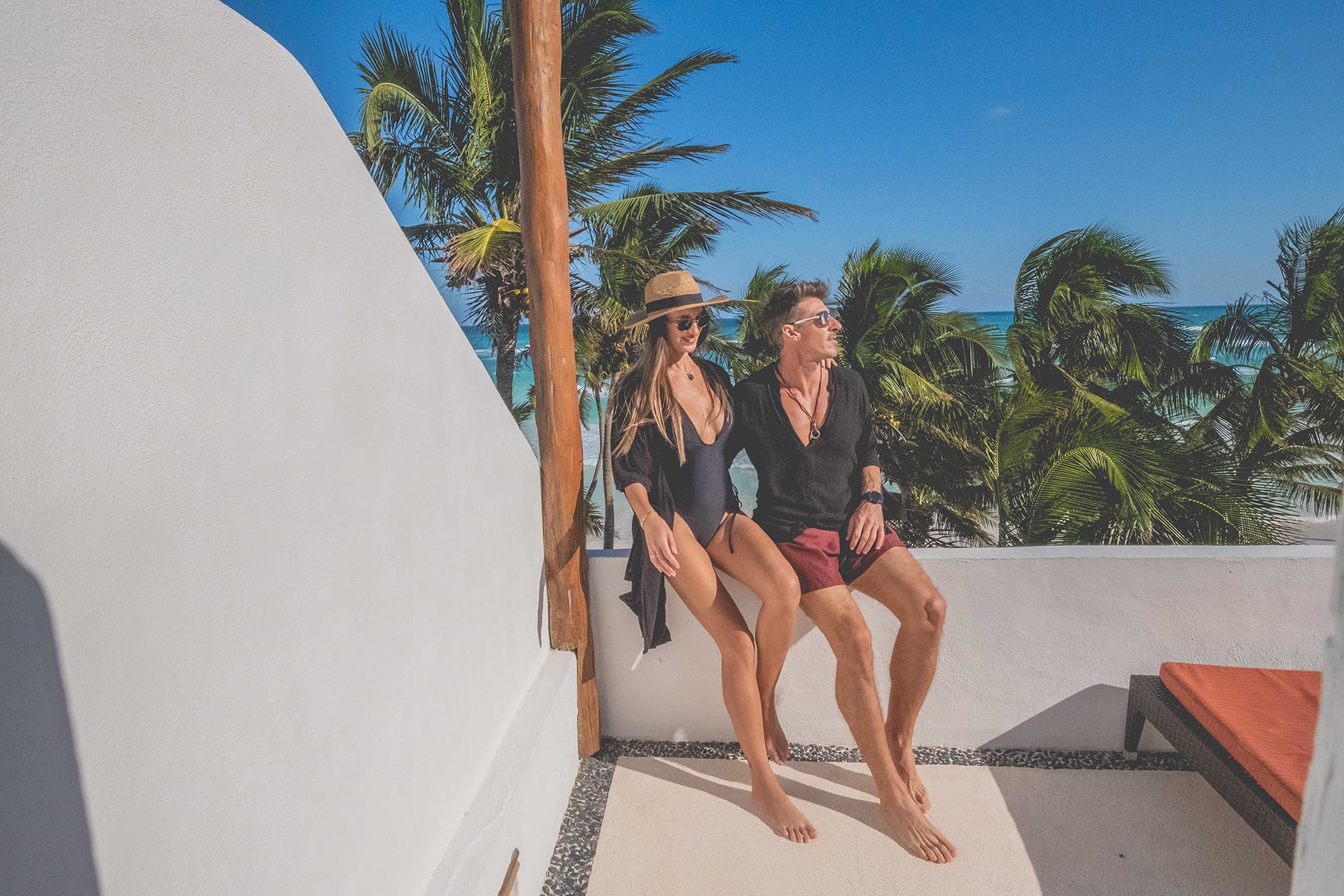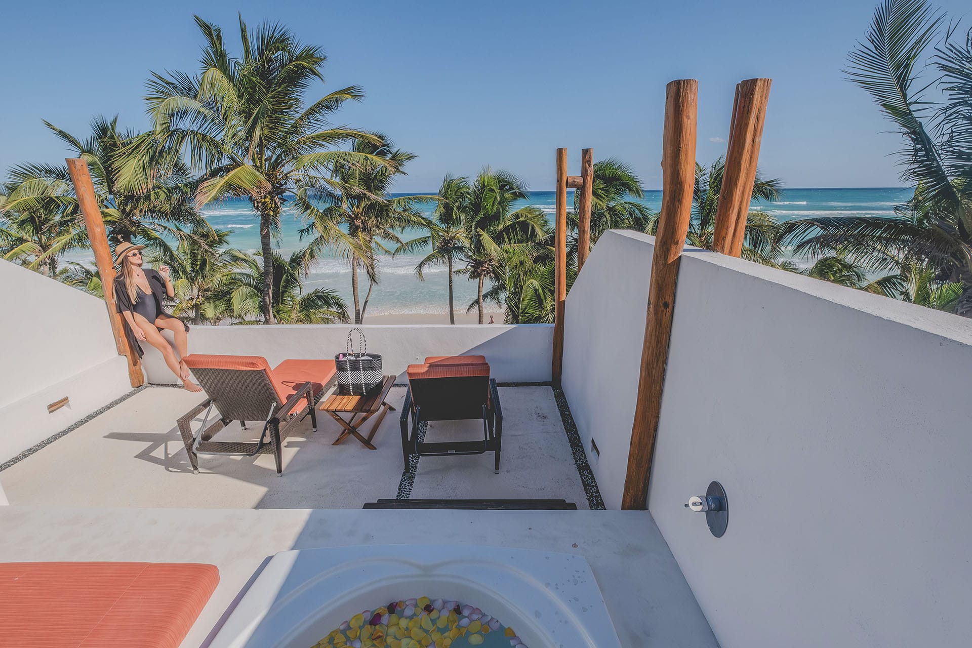 Nossos quartos na cobertura ficam todos no primeiro andar e oferecem o máximo de privacidade. Vistas incríveis tanto do terraço à beira-mar quanto do terraço privativo da cobertura, que tem acesso privativo a partir do quarto. Os quartos incluem terraço ao ar livre com banheira de hidromassagem, sofá queen size, duas espreguiçadeiras, mesa e cadeiras e rede para o máximo relaxamento. Se você precisar de um, todos os terraços da cobertura podem ser equipados com guarda-sol.